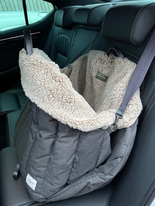 Fallegt, einstakt og vandað sæti í bílinn fyrir hunda. Kemur í veg fyrir að hundurinn sé á flakki um bílinn og eykur öryggi og þægindi fyrir hundinn í bílferðum. Sætið er með taumi að innanverðu sem festist í beisli hundsins og sætið festist við bílsætið eða höfuðpúða, með ól sem hægt er að stilla eftir þörfum. Úr vönduðu, náttúrulegu, sterku, endingargóðu og vatnsfráhrindandi efni sem auðveldar til muna að halda því hreinu og snyrtilegu. Handsaumað.